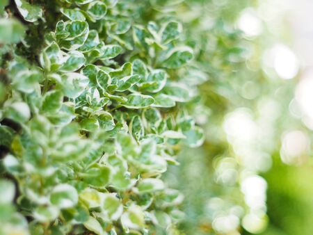 Close up view of a beautiful green plant in the garden on a sunny day. A beautiful boxwood bush with small, partially light and dark green leaves