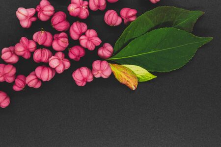 Background composition of Red Cascade spindle (Euonymus europaeus) blossoms and autumn colorful leaves on black matte background with copy space