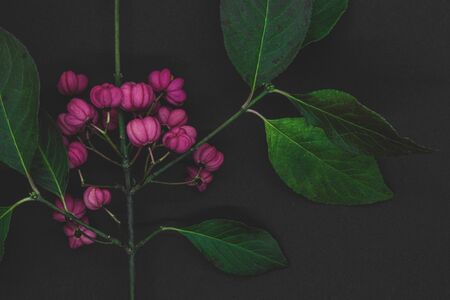Red Cascade spindle (Euonymus europaeus) tree twig with purple, pink blossoms on it and placed on matte black background with copy space