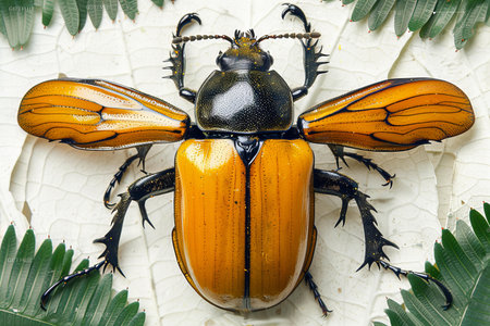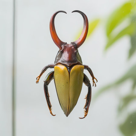 A striking beetle with vibrant colors and prominent horns is showcased in a natural environment highlighting its unique features and beauty.