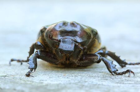 closeup of rhinoceros beetle on granite stone with blurred background