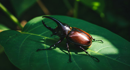 Solitary Rhino Beetle: A Majestic Insect Resting on a Green Leaf