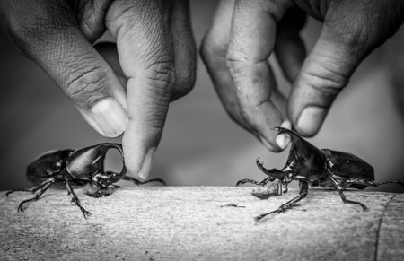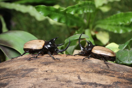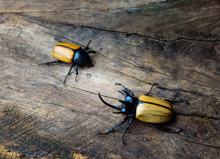 Rhinoceros beetle Fighting one another on wood in forest