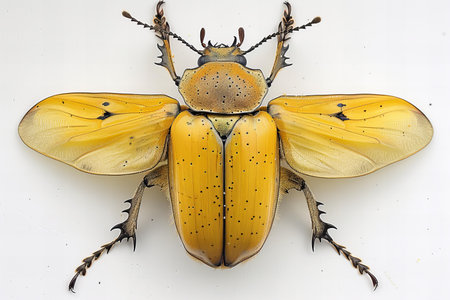 A close up of a yellow beetle isolated on a white background.