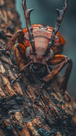 Macro view of stag beetle on bark, detailed insect close-up