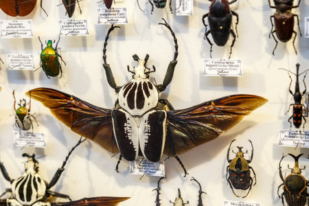 Moscow, Russia - March 12, 2019: Collection of dried natural insects in the Apothecary garden. Set of pin insect in biology museum. Zoology background