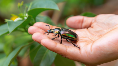 A vibrant beetle rests on a human hand, showcasing intricate details and colors against a backdrop of lush green leaves, highlighting nature's beauty.