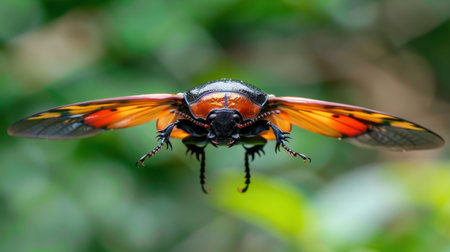 A striking photograph of a colorful insect with transparent wings captured in mid-flight against a lush green backdrop, showcasing nature's beauty and diversity.