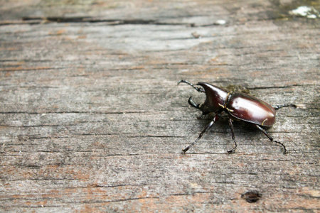 Five-horned rhinoceros beetle expand wings on wood with copy space. This insect found in Samoeng mountain (tropical forest) in Chiang Mai, Thailand