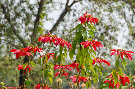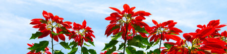 Panorama view blossom poinsettia sunny blue sky in Mai Chau, Hoa Binh, Vietnam, tropical flowers well known for red and green foliage widely used in Christmas floral displays, perennial plant. Asia