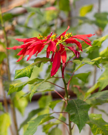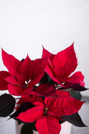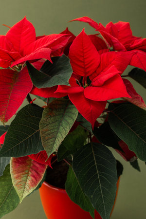 Euphorbia is a beautiful poinsettia green plant with bright red leaves. Christmas holidays, popular seasonal decoration.