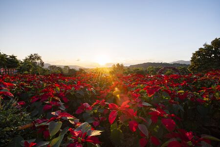 Landscape red poinsettia in the garden with sunset and mountain background / Poinsettia Christmas traditional flower outdoors decorations Merry Christmas