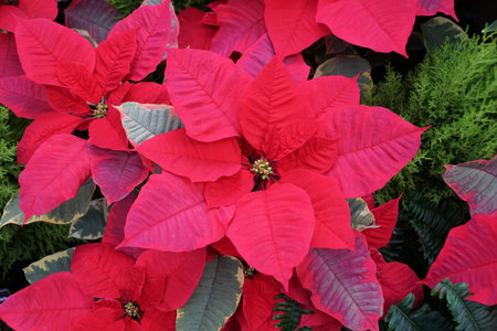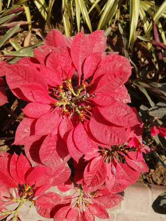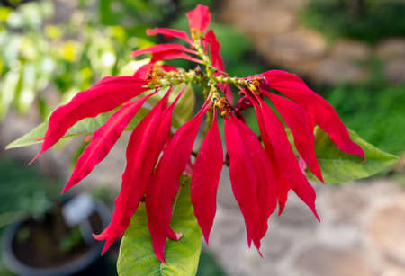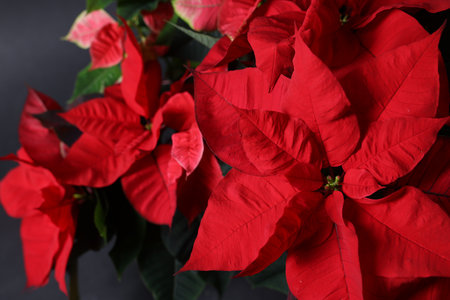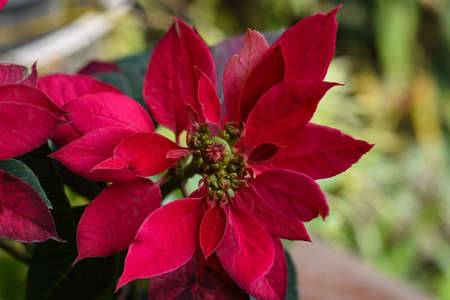 Closeup of red poinsettia flowers Euphorbia pulcherrima. Red poinsettia Christmas flower. Nobody, street view, selective focus, copyspace for text
