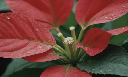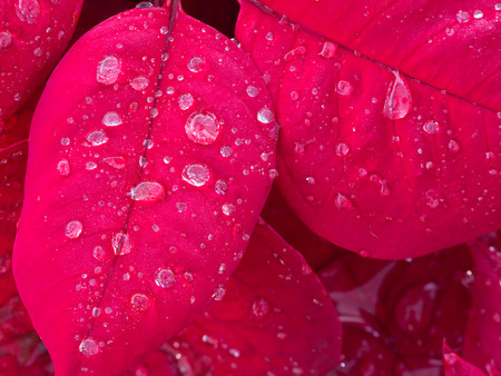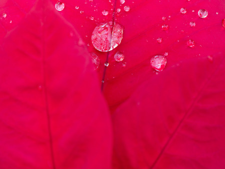 macro close up of beautiful red poinsettia poinsettia plant leaf with drops of water, christmas holydays