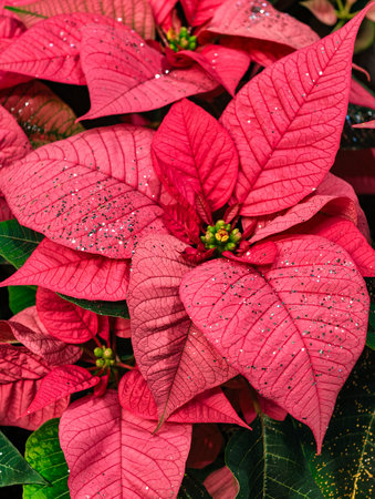 Pink Poinsettia Christmas Flower with Glitter Decoration Close-Up Holiday Plant for Festive Seasonal Display Winter Background