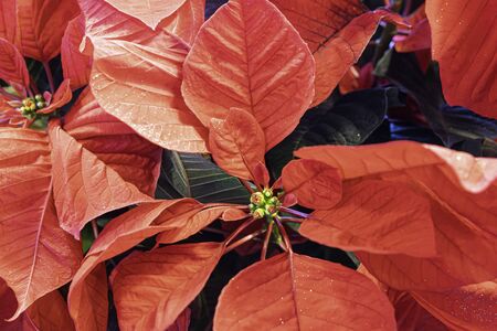 Colorful beautiful poinsettia plant for Christmas holiday, macro shot photo.