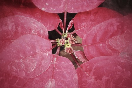 Closeup of poinsettia foliage. Poinsettia (Euphorbia pulcherrima) pink bracts surrounding flowers