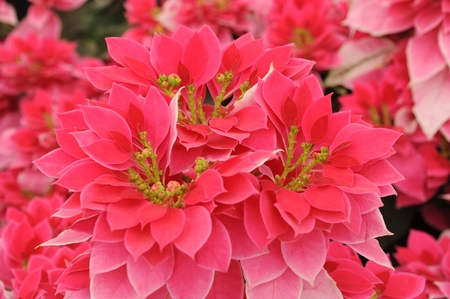 Close up of pink Christmas stars. Pink Poinsettia flowers or Euphorbia Pulcherrima