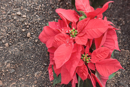 Vibrant Poinsettias flourish in rich soil, red bracts and green leaves forming festive, ornamental display. Holiday plants evoke warmth and tradition with their striking seasonal contrast