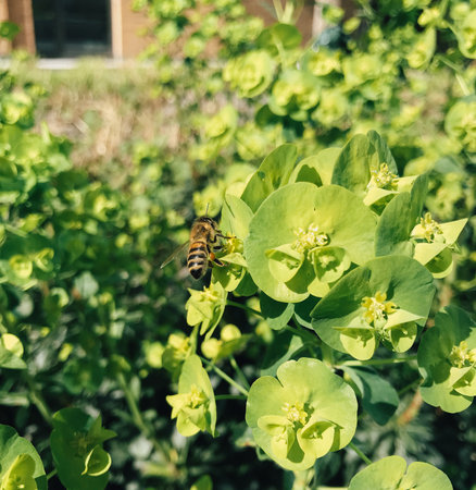 Closeup of yellow Euphorbia cornigera flowers in a garden