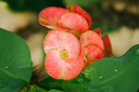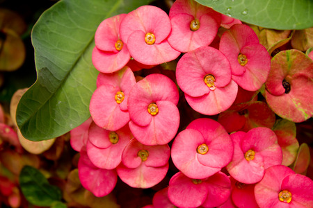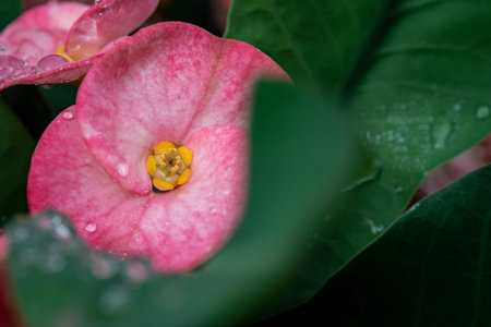 Close up Christ Thorn flower or Euphorbia milli with water drop after rain, nature blossoming in the garden, pink flower and green leaf, Selective focus.