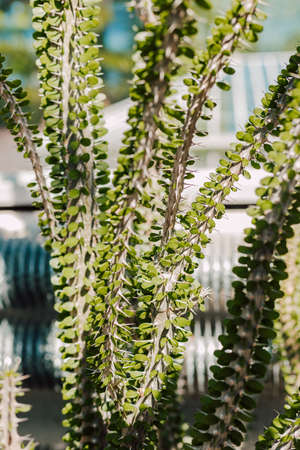 The crown of thorns also called Christ plant, Euphorbia milii, or Christ thorn in the plantation of houseplants and succulent shrubs. Asia.