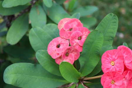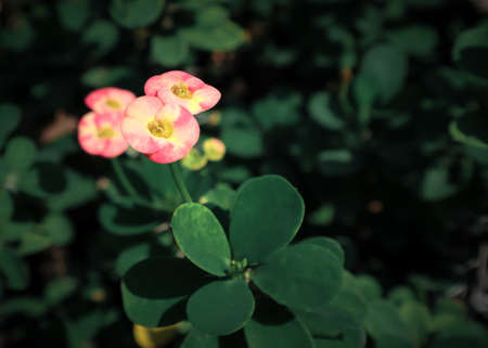 Christ Thorn, Euphorbia milii or Euphorbiaceae or Euphorbia milii Des Moul or Crown of thorns or Christ thorn or pink flower in the garden