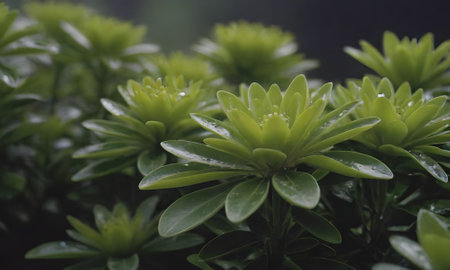 Close up of green leaves with water droplets on the leaves.