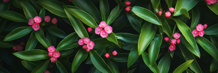 Small pink flowers are scattered among rich green foliage, creating a colorful contrast. This lush plant life thrives in a sunny environment, showing natures beauty and diversity.