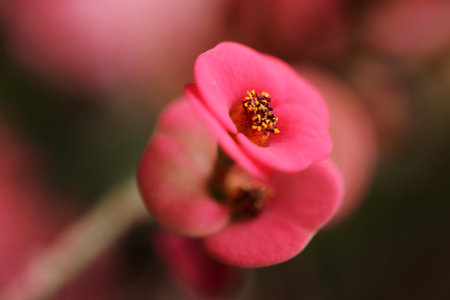 Euphorbia milii, red flower against brown bokeh background. This flower is also known as thorn of christ