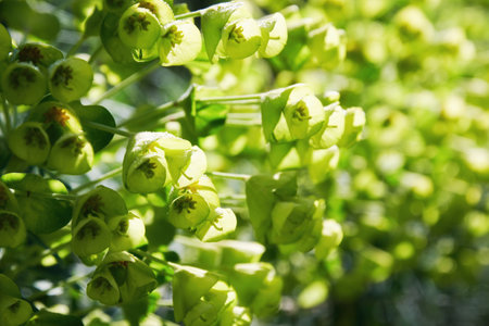 Sunlit light green spurge flower buds background. Abstract nature and herbs textures
