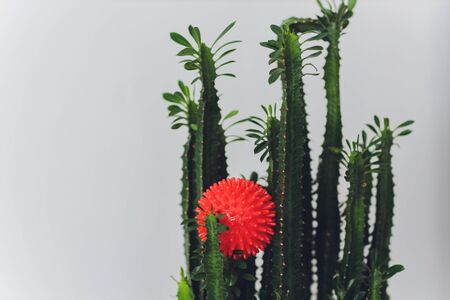 cactus red virus molecules on a white background, concept of colds and viruses, copy space.