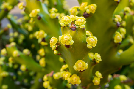 Closeup of yellow Euphorbia cornigera flowers in a garden