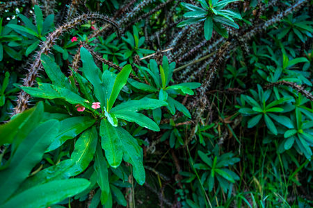 Christ Thorn, Euphorbia milii or Euphorbiaceae or Euphorbia milii Des Moul or Crown of thorns or Christ thorn or pink flower in the garden