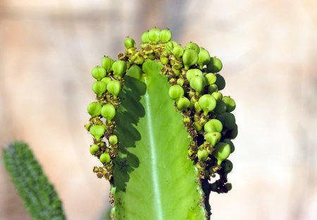 Detail of the branches of a flowering euphorbia ingens in mid-afternoon sun. Texture and contrast of a cactus.