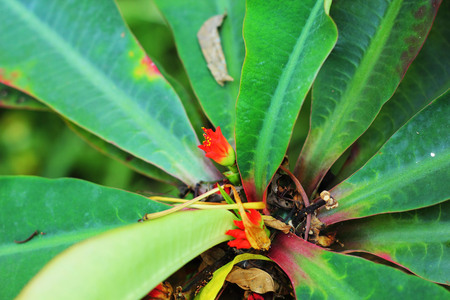 red flowers of Griffith's. on a green background and with. close-up. Euphorbia griffithii