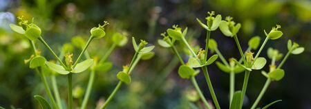 Sunlit light green spurge flower buds background. Abstract nature and herbs textures