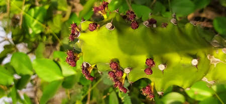 Closeup of the leaves of the euphorbia tithymaloides plant in the garden.