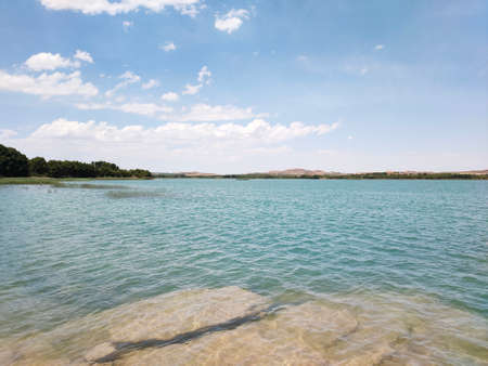 White coast with turquoise water and green pine trees and clouds. Reservoir on the Euphrates River