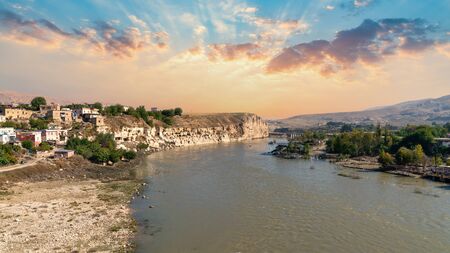 Hasankeyf, Turkey - October 2019: Remains of the town of Hasankeyf on the River Tigris, famous with stone caves after it is evacuated. The town will be sunk under water of ilisu dam