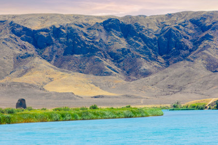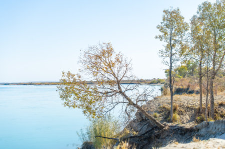 River in the steppe. Prairies. A serene oasis cutting through the arid heart of the desert, this mesmerizing river casts a stunning reflection of vibrant autumn hues onto the surrounding steppe
