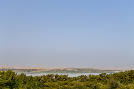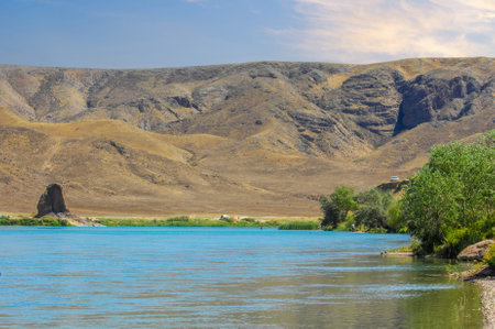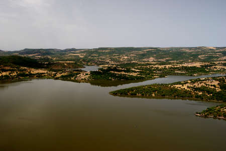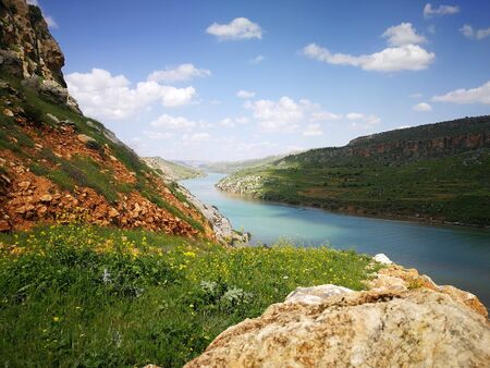 Panoramic view of the Tigris river valley. Green water of river and mountains. Landscape near the Hasankeyf town, Turkey, Batman Province