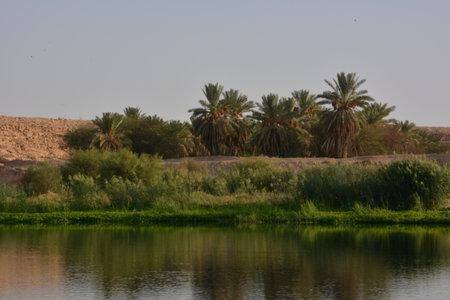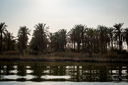 Iconic Palm Trees Line the Riverbank of the Shatt al-Arab, Their Silhouettes and Reflections Mirroring the Tranquil Water Surface at Twilight.