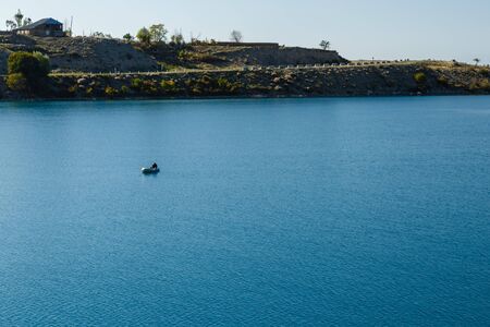 South shore of Issyk-kul lake in Kyrgyzstan, lonely fisherman on a boat on Issyk-Kul Lake
