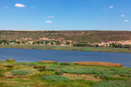 Beautiful view of the lake on a sunny summer day. Natural background.