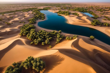 High-angle view of a river flowing through a desert landscape. The river is a vibrant teal color, contrasted with the golden-yellow sand dunes. Lush green vegetation lines the riverbanks. The image captures the dramatic beauty of the desert environment.