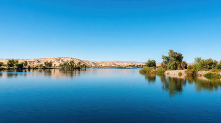 Explore this stunning river landscape, where tranquil waters reflect lush trees under a clear sky. Experience the beauty of nature in perfect harmony.