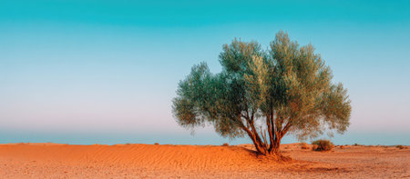 Lone tree stands amidst a vast expanse of orange desert sand, with a clear, light-filled blue sky.