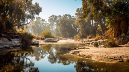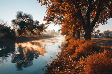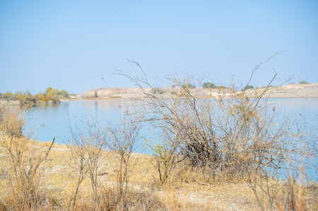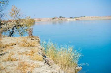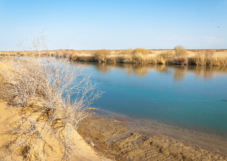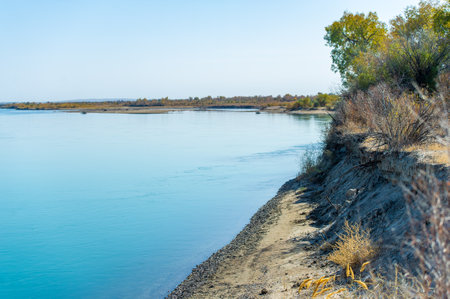 River in the steppe. Prairies. A serene oasis cutting through the arid heart of the desert, this mesmerizing river casts a stunning reflection of vibrant autumn hues onto the surrounding steppe