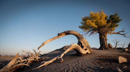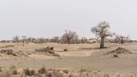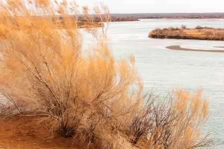 Unique plants, saxaul and relic poplar Turanga in sand arid steppe or desert of Kazakhstan in autumn.